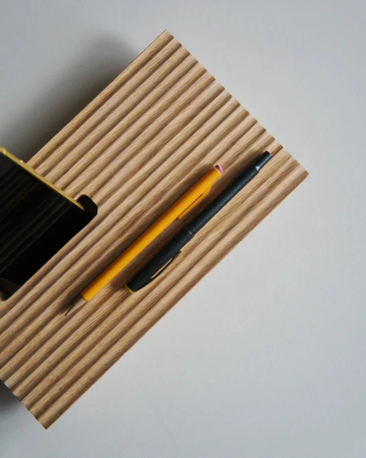 As a birthday present to her husband, Caleb's wife asked me to design a desk phone stand that could be used while charging and could also hold a variety of writing utensils.