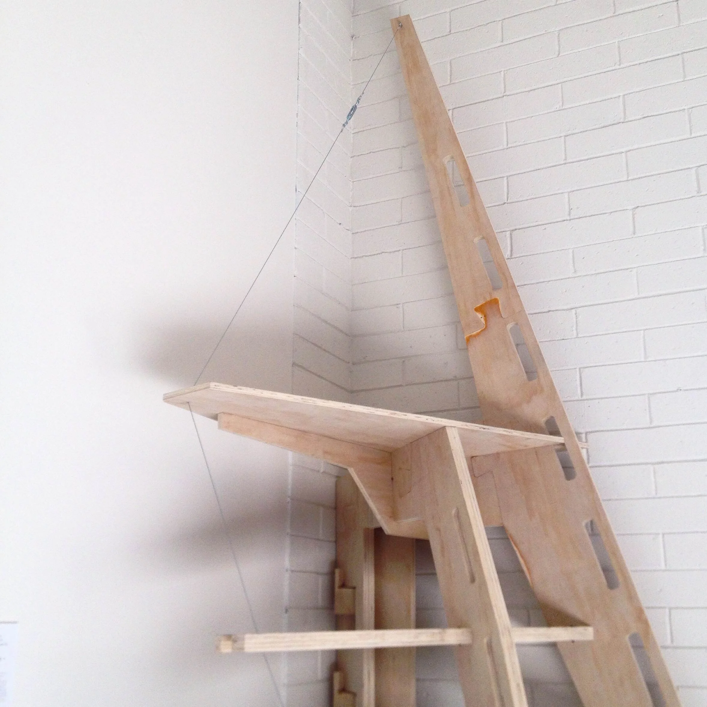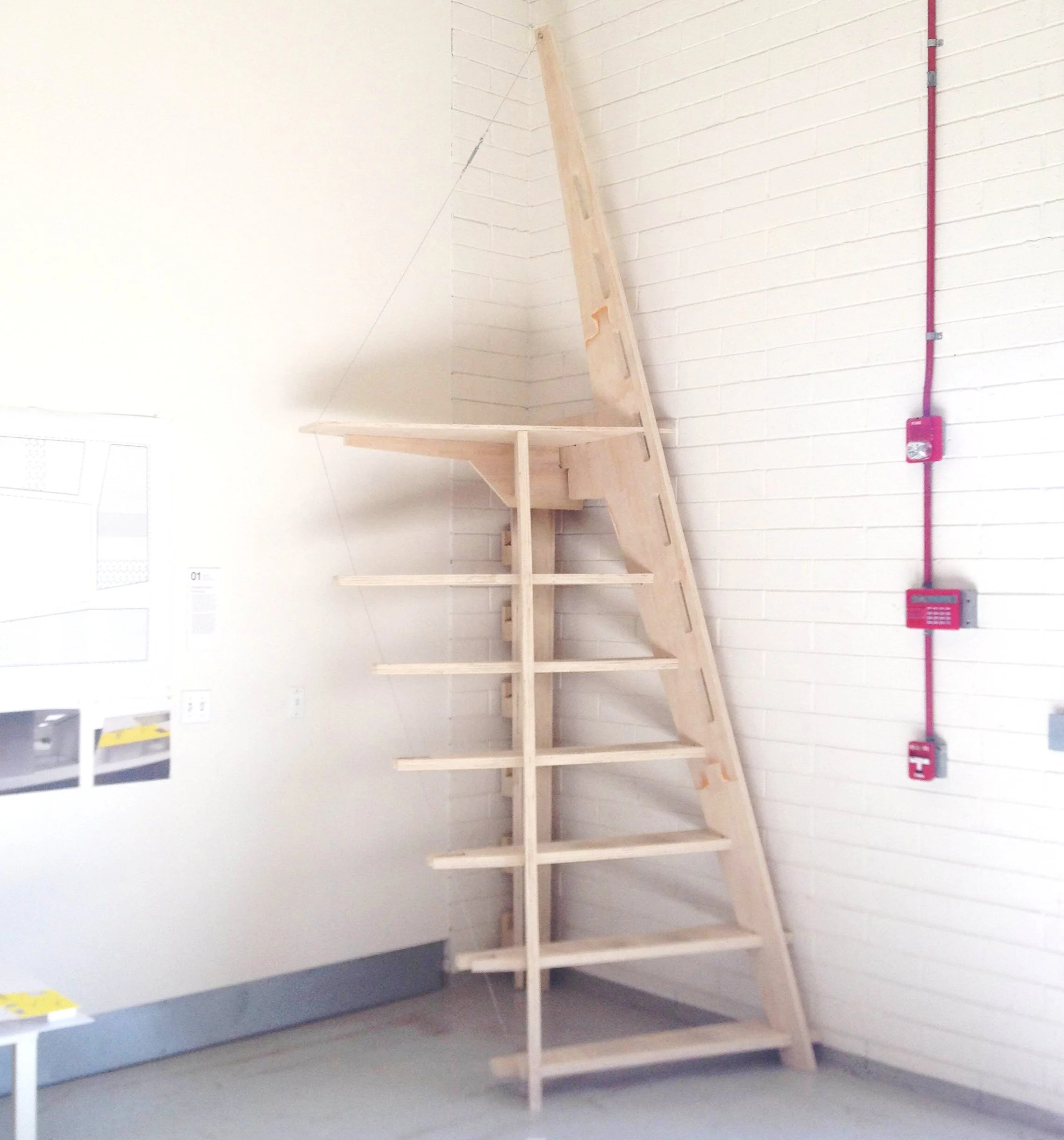 The team was tasked with designing, manufacturing, and installing a structure that ascended twelve feet and allowed for a perspective that was otherwise inaccessible. Based on observations and analysis of a lobby gallery, the team created design objectives. Primarily, the ladder should provide a resting point from which to view the gallery from a new perspective and to sit while doing so. The team agreed that the structure should allow for more than simply moving a person from point to point. The steps extend past what is necessary to provide shelving to augment the gallery and lobby space.