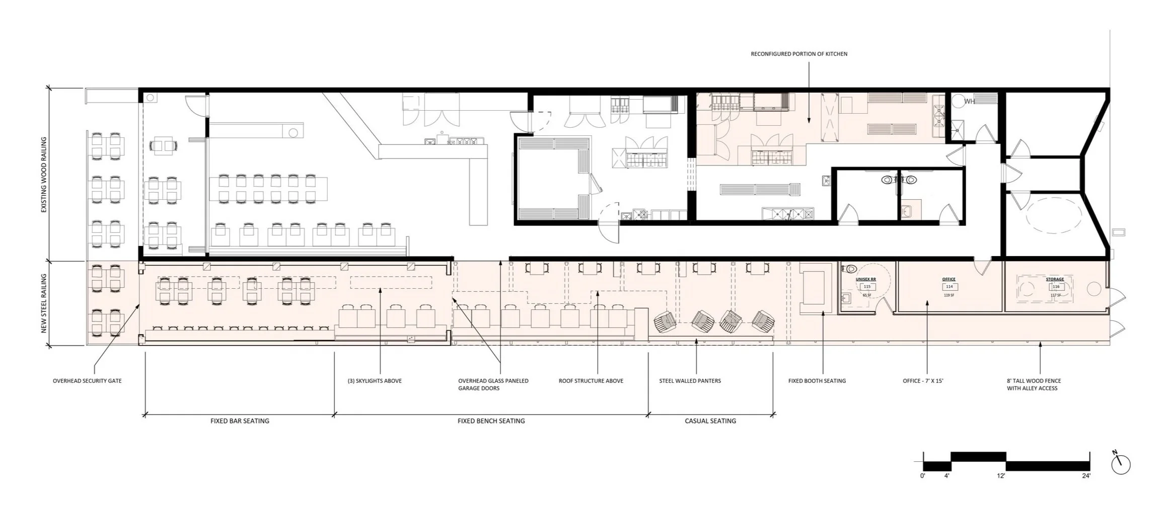 Project provided drawings for the renovation of an existing restaurant kitchen and the expansion of the dining area next door, known as the Annex. Each building had its own history and thus took on its own distinct character. The Annex came with the challenge of being a narrow lot and the structural limitations of not allowing the interior seating areas to directly connect. The design team turned their focus to the “backyard” of the Annex to be the unexpected oasis after entering the front porch and passing through the house. The shade structure in the back borrows from basic house and framing vernacular.