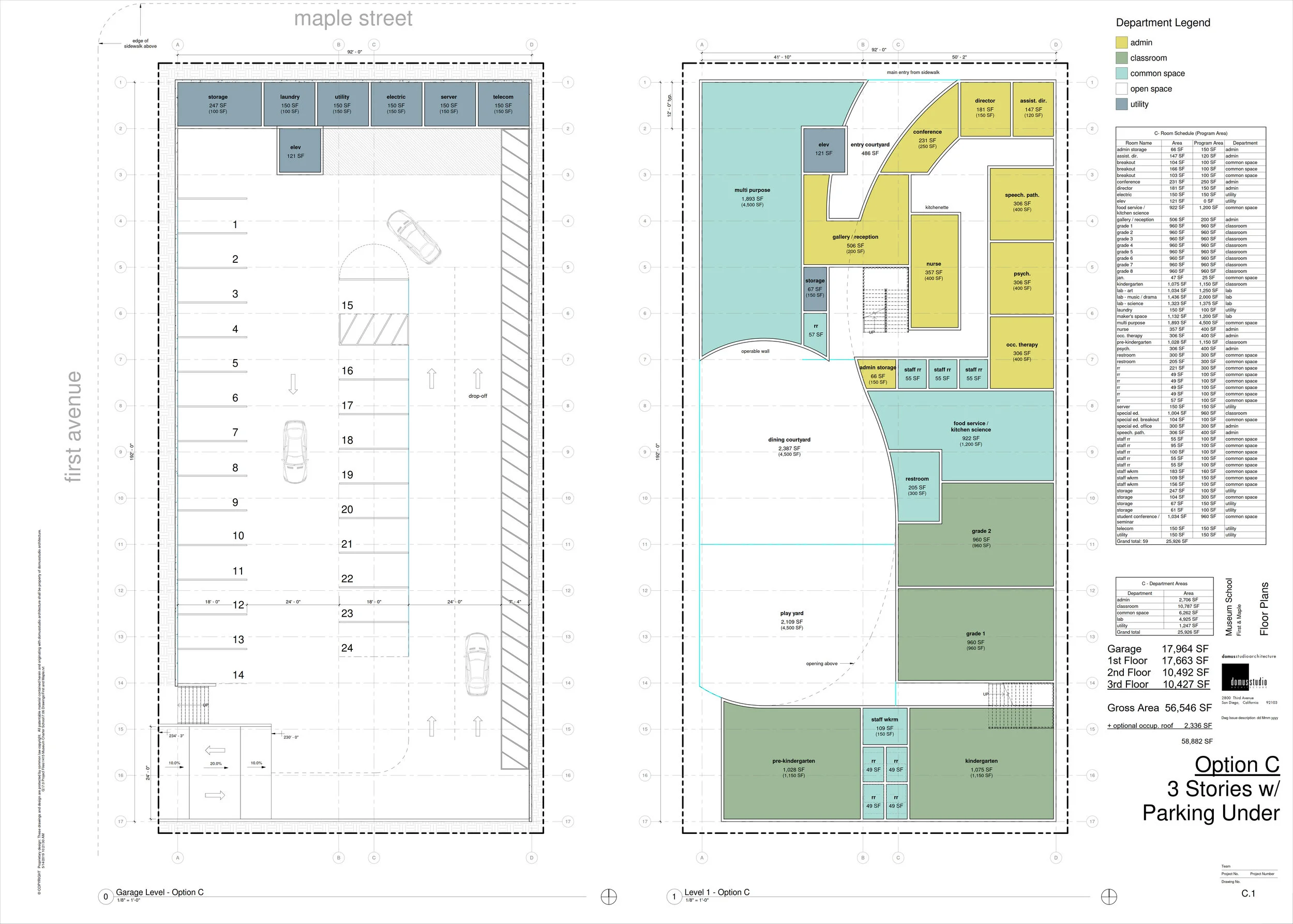 The existing charter school, located in Banker’s Hill, currently rents space and has been searching for a permanent site to expand their program to include more classrooms, multipurpose, and gallery space. Our team conducted a number of site studies as the District found land for sale. The program remaining the same made led the team to exploring how pre-fabricated units could be deployed on different sites.